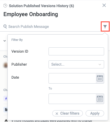 , to filter for specific versions by Version ID, Publisher, or Date.