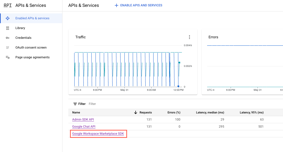In the sidenav, select APIs & Services > Enabled APIs and services. The APIs & Services screen displays.