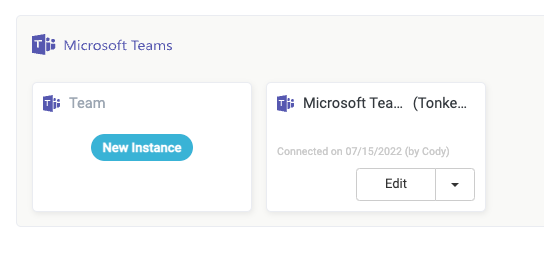 In the Microsoft Teams section, select New Instance. A new window displays asking you to authenticate with Microsoft Teams.