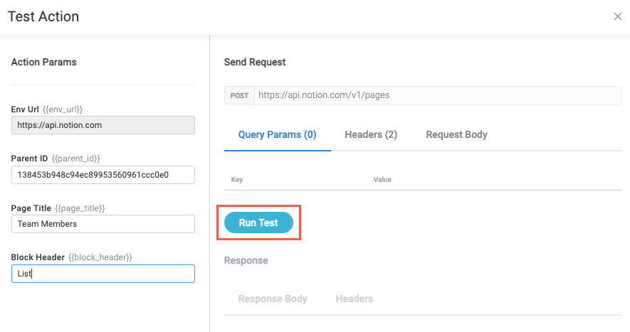 { "parent": { "database_id": "" }, "properties": { "title": { "title": [ { "type": "text", "text": { "content": "" } } ] } }, "children": [ { "object": "block", "type": "heading_2", "heading_2": { "rich_text": [ { "type": "text", "text": { "content": "" } } ] } } ] }For each required dynamic value, create a new param and include it in the body. For this action,