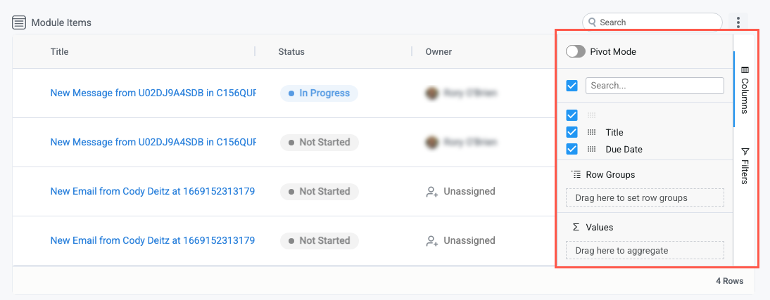 Improved UI for items table widgets - Previously, many of the most powerful visualization and filter capabilities for items table-type widgets like the Module Items widget were located in the three-dots menu in the corner of the widget. To make these feature easier to see and use, we've redesigned this area to relocate the most common controls and generally make the advanced visualization features more usable. In particular, Charts and Filters have been moved out to their own dedicated buttons.