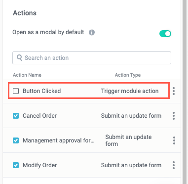 Interface sequences still open on a new tab by default; to set the sequence to open in a modal, locate the button that opens the relevant sequence and de-select the Open in new tab toggle.